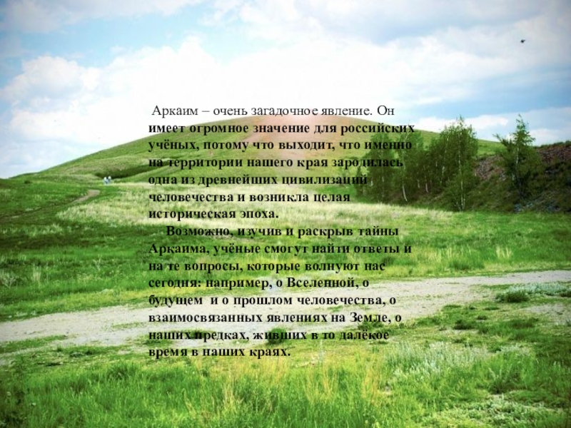 Слайд 12 Аркаим – очень загадочное явление. Он имеет огромное значение для
