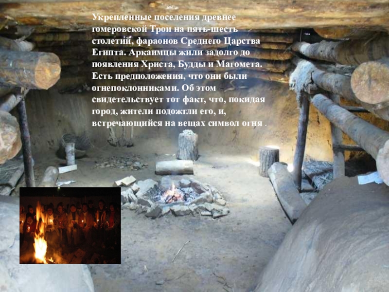 Царства Египта. Аркаимцы жили задолго до появления Христа, Будды и Магомета. Есть предположения, что они были огнепоклонниками. Об этом свидетельствует тот факт, что, покидая город, жители подожгли его, и, встречающийся на вещах символ огня .