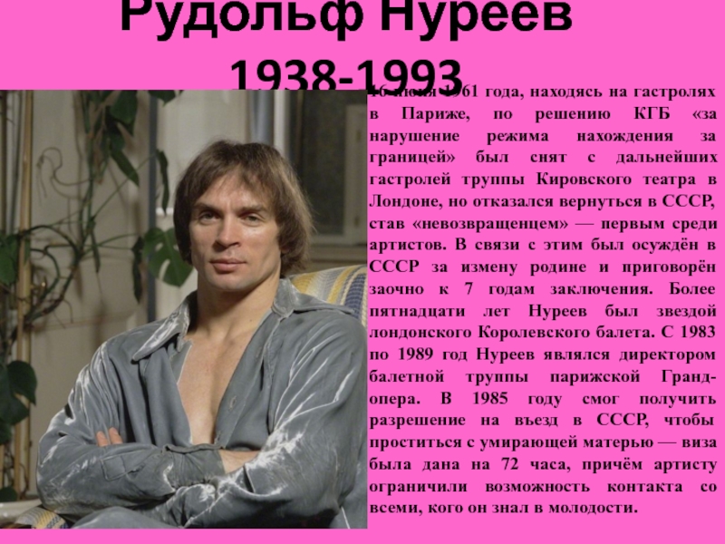 по решению КГБ «за нарушение режима нахождения за границей» был снят с дальнейших гастролей труппы Кировского театра в Лондоне, но отказался вернуться в СССР, став «невозвращенцем» — первым среди артистов. В связи с этим был осуждён в СССР за измену родине и приговорён заочно к 7 годам заключения. Более пятнадцати лет Нуреев был звездой лондонского Королевского балета. С 1983 по 1989 год Нуреев являлся директором балетной труппы парижской Гранд-опера. В 1985 году смог получить разрешение на въезд в СССР, чтобы проститься с умирающей матерью — виза была дана на 72 часа, причём артисту ограничили возможность контакта со всеми, кого он знал в молодости.