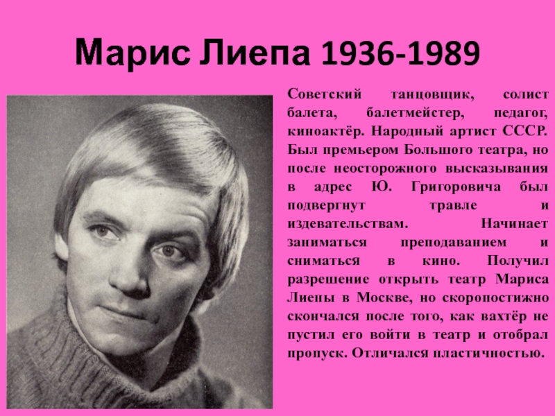 Советский артист балета, балетмейстер, актёр, коллекционер и фотограф. В 1967—1974 годах