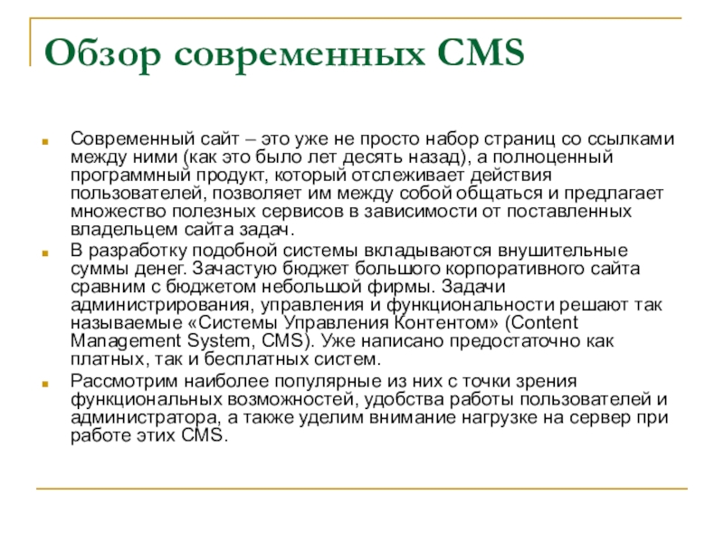 В разработку подобной системы вкладываются внушительные суммы денег. Зачастую бюджет большого корпоративного сайта сравним с бюджетом небольшой фирмы. Задачи администрирования, управления и функциональности решают так называемые «Системы Управления Контентом» (Content Management System, CMS). Уже написано предостаточно как платных, так и бесплатных систем.