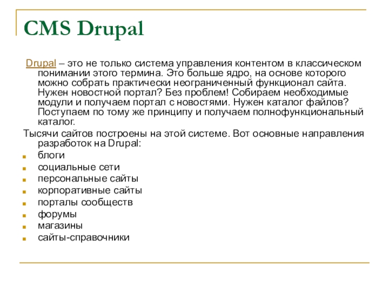 Тысячи сайтов построены на этой системе. Вот основные направления разработок на Drupal: