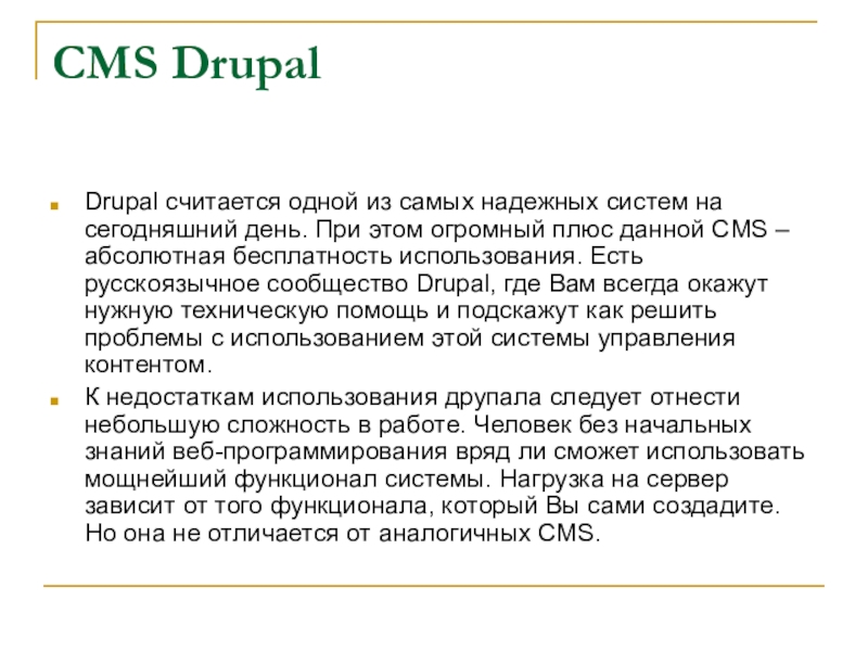 К недостаткам использования друпала следует отнести небольшую сложность в работе. Человек без начальных знаний веб-программирования вряд ли сможет использовать мощнейший функционал системы. Нагрузка на сервер зависит от того функционала, который Вы сами создадите. Но она не отличается от аналогичных CMS.