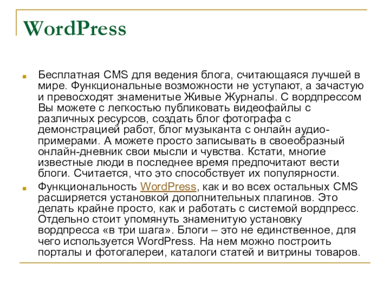 Бесплатная CMS для ведения блога, считающаяся лучшей в мире. Функциональные возможности