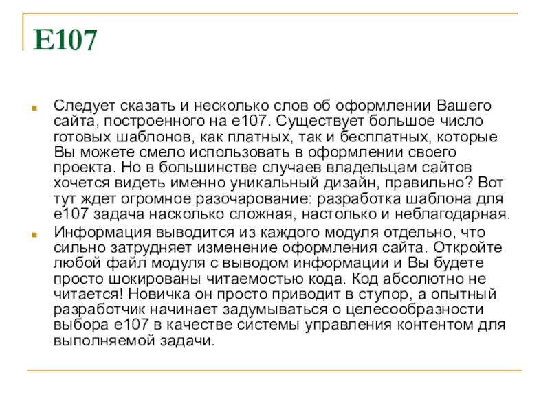 Информация выводится из каждого модуля отдельно, что сильно затрудняет изменение оформления сайта. Откройте любой файл модуля с выводом информации и Вы будете просто шокированы читаемостью кода. Код абсолютно не читается! Новичка он просто приводит в ступор, а опытный разработчик начинает задумываться о целесообразности выбора е107 в качестве системы управления контентом для выполняемой задачи.