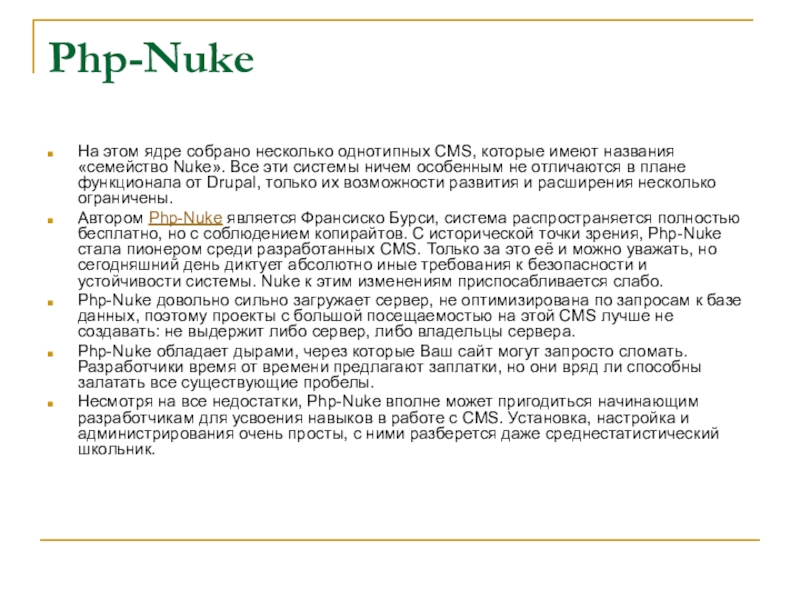 Php-Nuke довольно сильно загружает сервер, не оптимизирована по запросам к базе данных, поэтому проекты с большой посещаемостью на этой CMS лучше не создавать: не выдержит либо сервер, либо владельцы сервера.