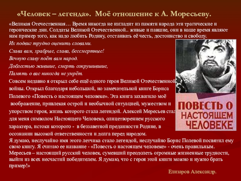 Полевого «Повесть о настоящем человеке». Эта книга захватило моё