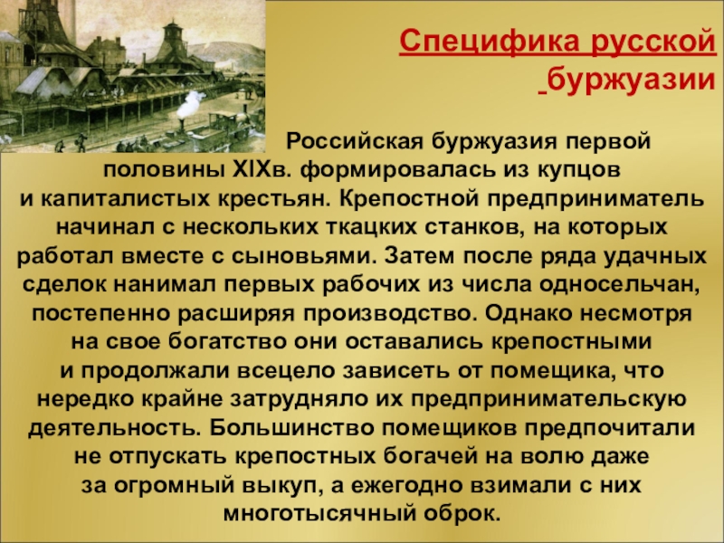 В первой половине XIX столетия брянские предприниматели начали активно подавать прошения об отводе земли под заведения. У торговцев пенькой появилась заинтересованность в переработке товара, возник ряд новых канатных фабрик, продукция которых шла в черноморские порты и Константинополь. Действовали пивоваренные заводы, лесопилки, скорняжные, сапожные, швейные мастерские. Был распространен бурлацкий промысел - из Брянска отправлялись к Киеву, Херсону, Кременчугу