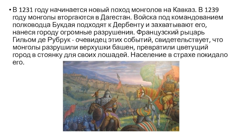 году монголы вторгаются в Дагестан. Войска под командованием полководца Букдая подходят к Дербенту и захватывают его, нанеся городу огромные разрушения. Французский рыцарь Гильом де Рубрук - очевидец этих событий, свидетельствует, что монголы разрушили верхушки башен, превратили цветущий город в стоянку для своих лошадей. Население в страхе покидало его.