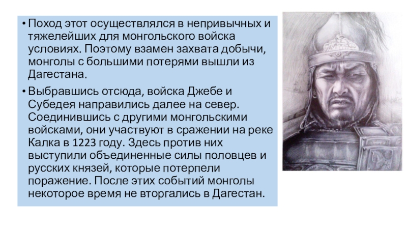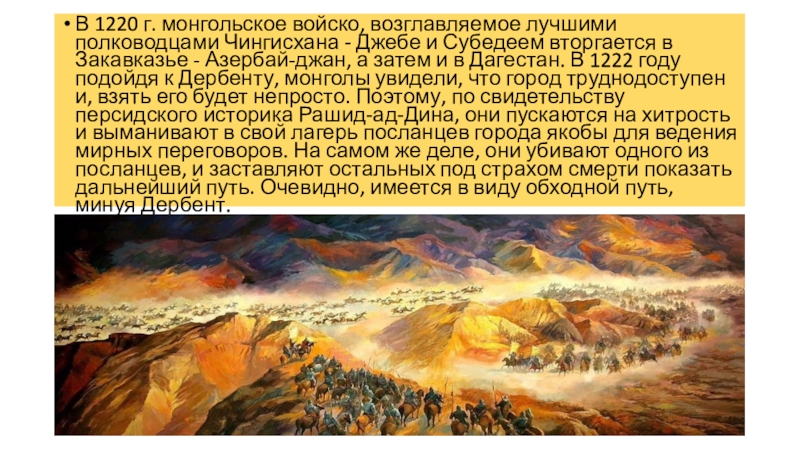 и Субедеем вторгается в Закавказье - Азербай-джан, а затем и в Дагестан. В 1222 году подойдя к Дербенту, монголы увидели, что город труднодоступен и, взять его будет непросто. Поэтому, по свидетельству персидского историка Рашид-ад-Дина, они пускаются на хитрость и выманивают в свой лагерь посланцев города якобы для ведения мирных переговоров. На самом же деле, они убивают одного из посланцев, и заставляют остальных под страхом смерти показать дальнейший путь. Очевидно, имеется в виду обходной путь, минуя Дербент.