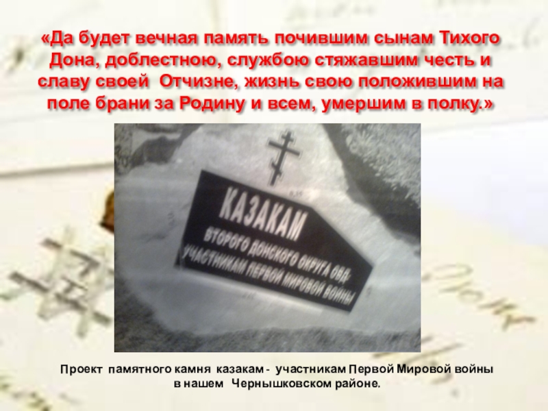 Проект памятного камня казакам - участникам Первой Мировой войны в нашем Чернышковском районе.