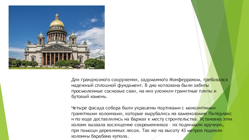 Слайд 5Для грандиозного сооружения, задуманного Монферраном, требовался надежный сплошной фундамент. В дно