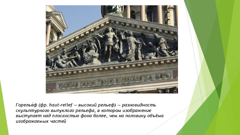 Слайд 12Горелье́ф (фр. haut-relief — высокий рельеф) — разновидность скульптурного выпуклого рельефа,