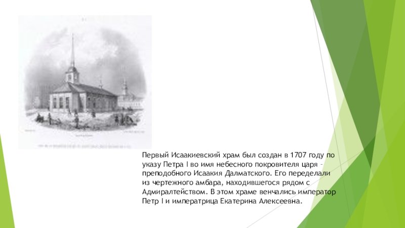 Слайд 2Первый Исаакиевский храм был создан в 1707 году по указу Петра