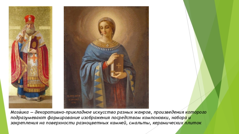 Слайд 18Моза́ика — декоративно-прикладное искусство разных жанров, произведения которого подразумевают формирование изображения