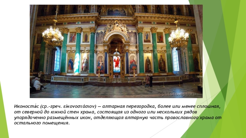 Слайд 14Иконоста́с (ср.-греч. εἰκονοστάσιον) — алтарная перегородка, более или менее сплошная, от