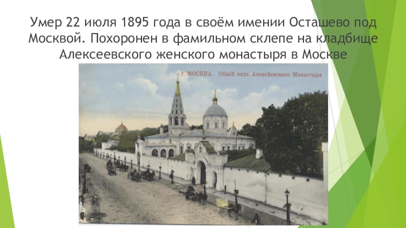 Слайд 10Умер 22 июля 1895 года в своём имении Осташево под Москвой.