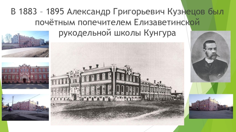 В 1883 – 1895 Александр Григорьевич Кузнецов был почётным попечителем Елизаветинской рукодельной школы Кунгура