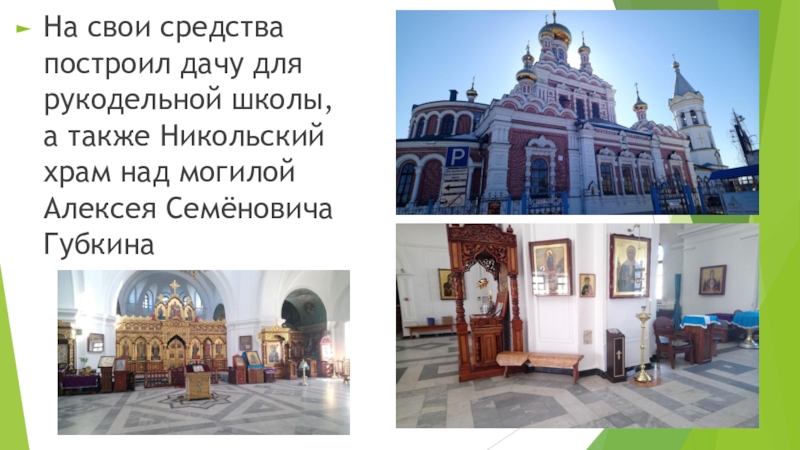 Слайд 7На свои средства построил дачу для рукодельной школы, а также Никольский