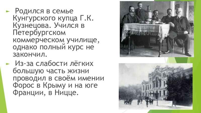 Слайд 2 Родился в семье Кунгурского купца Г.К. Кузнецова. Учился в Петербургском