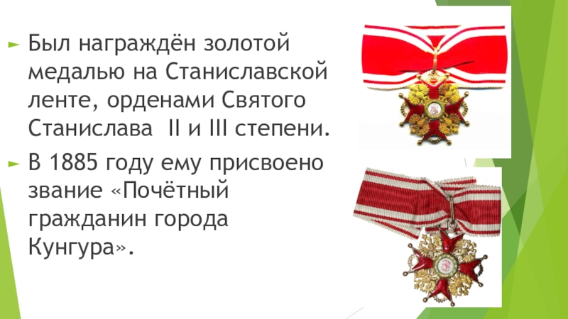 Слайд 9Был награждён золотой медалью на Станиславской ленте, орденами Святого Станислава II