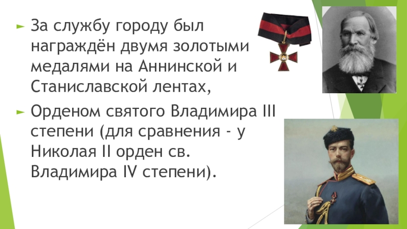 Слайд 14За службу городу был награждён двумя золотыми медалями на Аннинской и