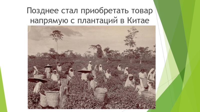 Слайд 5Позднее стал приобретать товар напрямую с плантаций в Китае