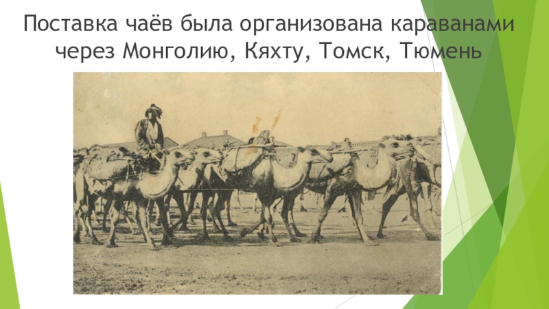 Слайд 6Поставка чаёв была организована караванами через Монголию, Кяхту, Томск, Тюмень