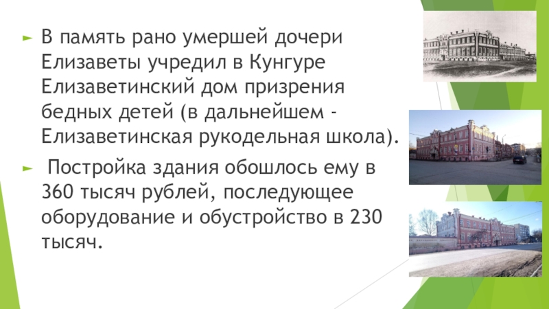 Слайд 10В память рано умершей дочери Елизаветы учредил в Кунгуре Елизаветинский дом