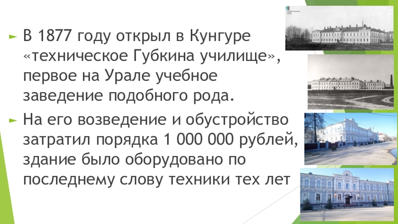 Слайд 12В 1877 году открыл в Кунгуре «техническое Губкина училище», первое на