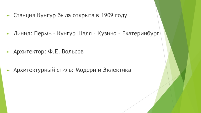 Станция Кунгур была открыта в 1909 годуЛиния: Пермь – Кунгур Шаля – Кузино – ЕкатеринбургАрхитектор: Ф.Е. ВольсовАрхитектурный