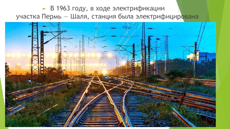 Слайд 18В 1963 году, в ходе электрификации участка Пермь — Шаля, станция была электрифицирована