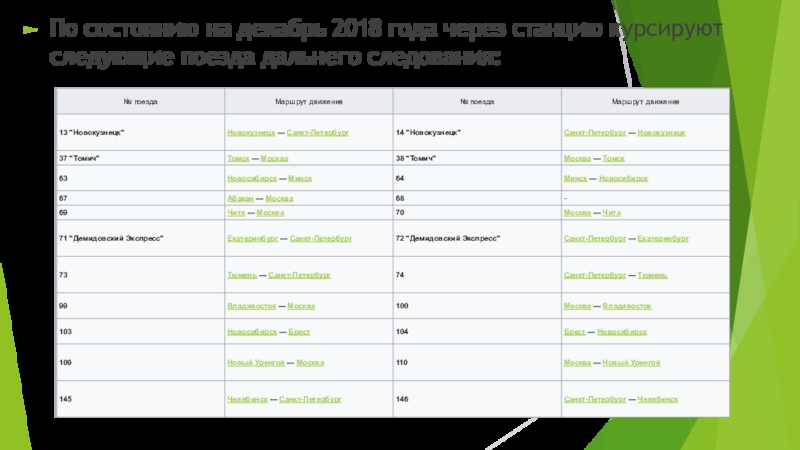 Слайд 27По состоянию на декабрь 2018 года через станцию курсируют следующие поезда дальнего