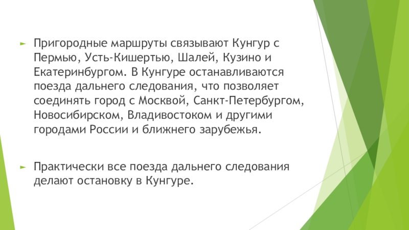 Практически все поезда дальнего следования делают остановку в Кунгуре.