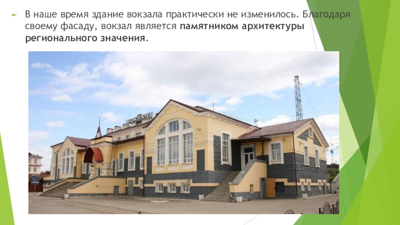 Слайд 19В наше время здание вокзала практически не изменилось. Благодаря своему фасаду,