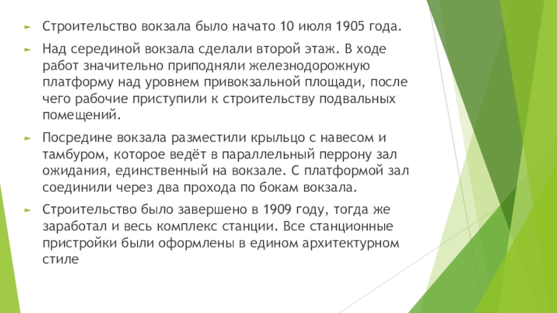 Слайд 14Строительство вокзала было начато 10 июля 1905 года.