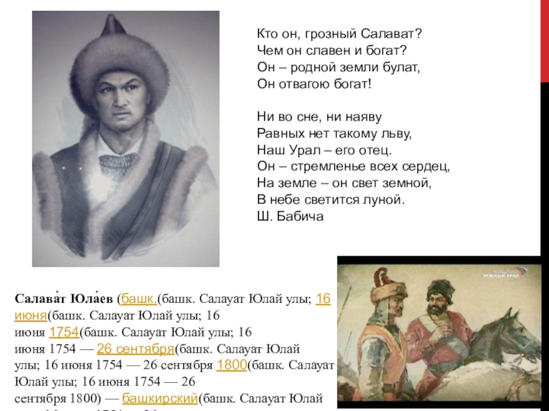 Салава́т Юла́ев (башк.(башк. Салауат Юлай улы; 16 июня(башк. Салауат Юлай улы; 16 июня 1754(башк. Салауат Юлай улы; 16 июня 1754 — 26 сентября(башк. Салауат Юлай улы; 16 июня 1754 — 26 сентября 1800(башк. Салауат Юлай улы; 16 июня 1754 — 26 сентября 1800) — башкирский(башк. Салауат Юлай улы; 16 июня 1754 — 26 сентября 1800) — башкирский национальный герой, один из руководителей Крестьянской войны 1773—1775 гг.(башк. Салауат Юлай улы; 16 июня 1754 — 26 сентября 1800) — башкирский национальный герой, один из руководителей Крестьянской войны 1773—1775 гг., сподвижник Емельяна Пугачёва(башк. Салауат Юлай улы; 16 июня 1754 — 26 сентября 1800) — башкирский национальный герой, один из руководителей Крестьянской войны 1773—1775 гг., сподвижник Емельяна Пугачёва; поэт-импровизатор(сэсэн).