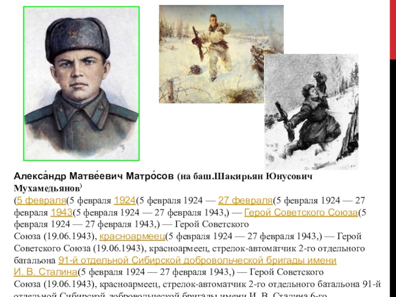 Слайд 14Алекса́ндр Матве́евич Матро́сов (на баш.Шакирьян Юнусович Мухамедьянов)