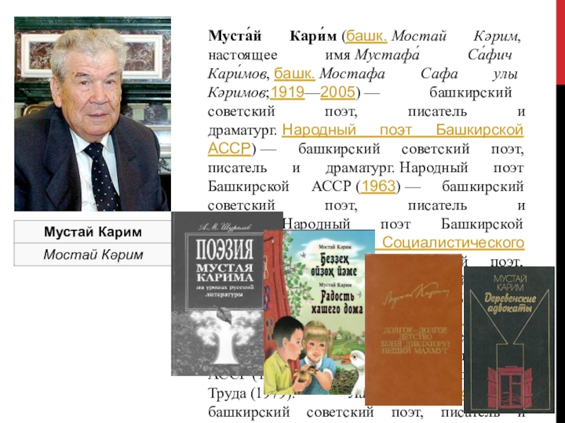 Слайд 17Муста́й Кари́м (башк. Мостай Кәрим, настоящее имя Мустафа́ Са́фич Кари́мов, башк. Мостафа Сафа улы Кәримов;1919—2005) — башкирский