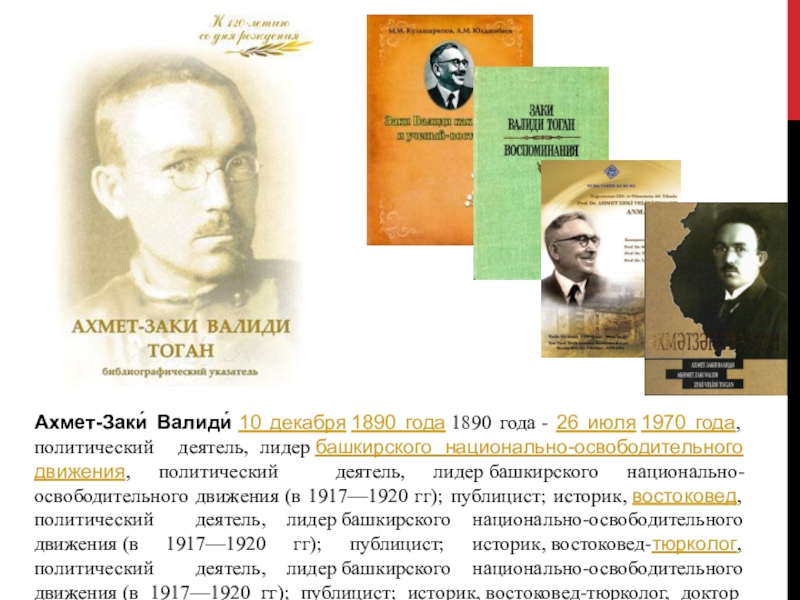 Слайд 11Ахмет-Заки́ Валиди́ 10 декабря 1890 года 1890 года - 26 июля 1970 года, политический деятель, лидер башкирского