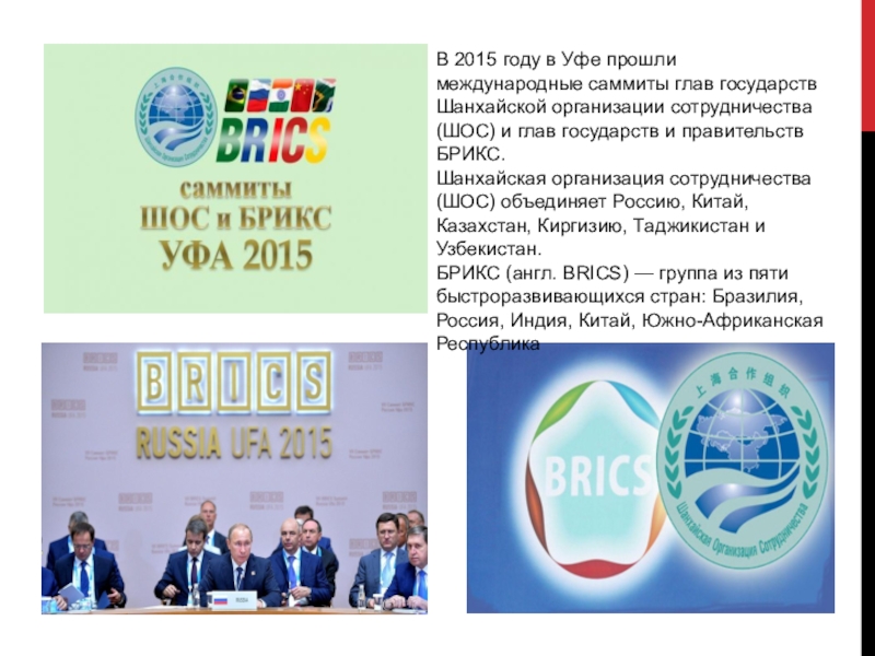 Слайд 23В 2015 году в Уфе прошли международные саммиты глав государств Шанхайской