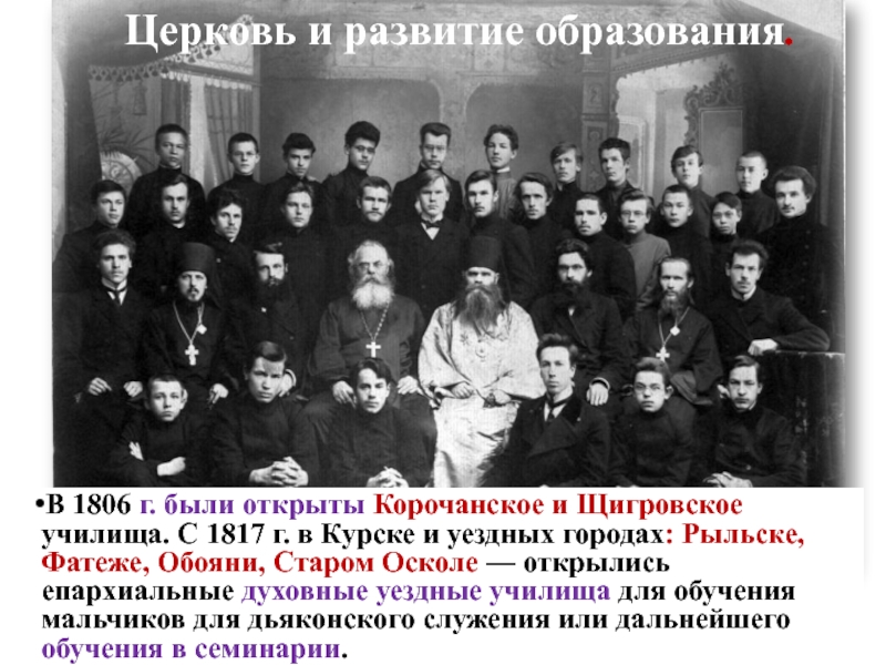 Щигровское училища. С 1817 г. в Курске и уездных городах: Рыльске, Фатеже, Обояни, Старом Осколе — открылись епархиальные духовные уездные училища для обучения мальчиков для дьяконского служения или дальнейшего обучения в семинарии.