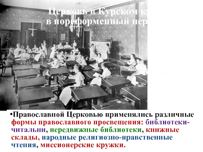 православного просвещения: библиотеки-читальни, передвижные библиотеки, книжные склады, народные религиозно-нравственные чтения, миссионерские кружки.