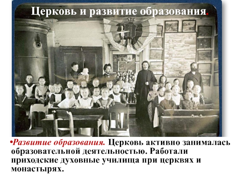 Слайд 10Развитие образования. Церковь активно занималась образовательной деятельностью. Работали приходские духовные училища