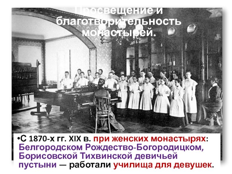 Белгородском Рождество-Богородицком, Борисовской Тихвинской девичьей пустыни — работали училища для девушек.
