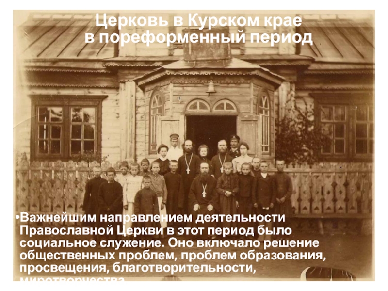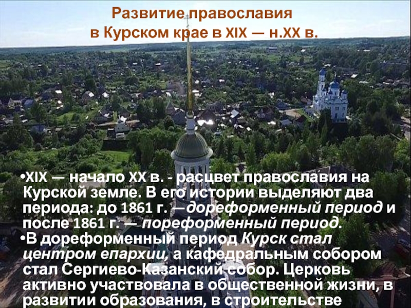 начало XX в. - расцвет православия на Курской земле. В его истории выделяют два периода: до 1861 г. —дореформенный период и после 1861 г. — пореформенный период.