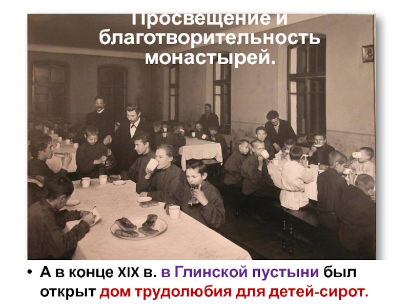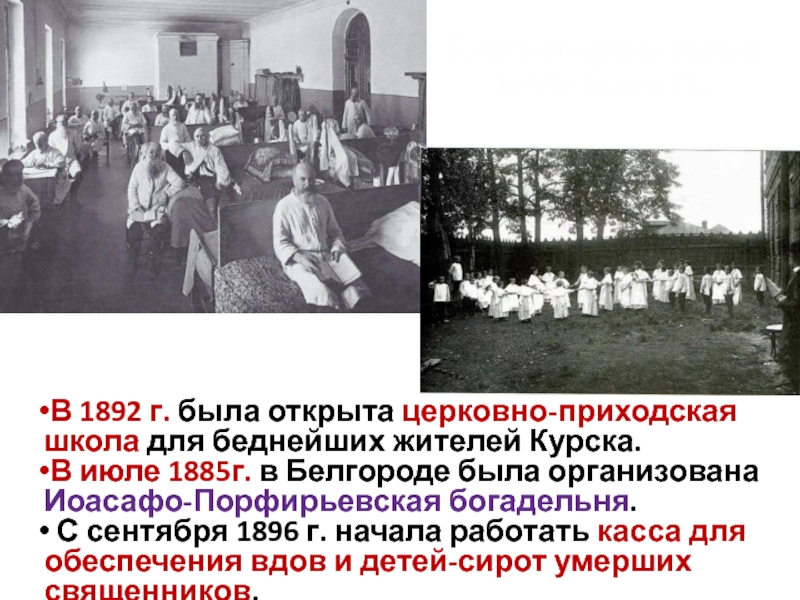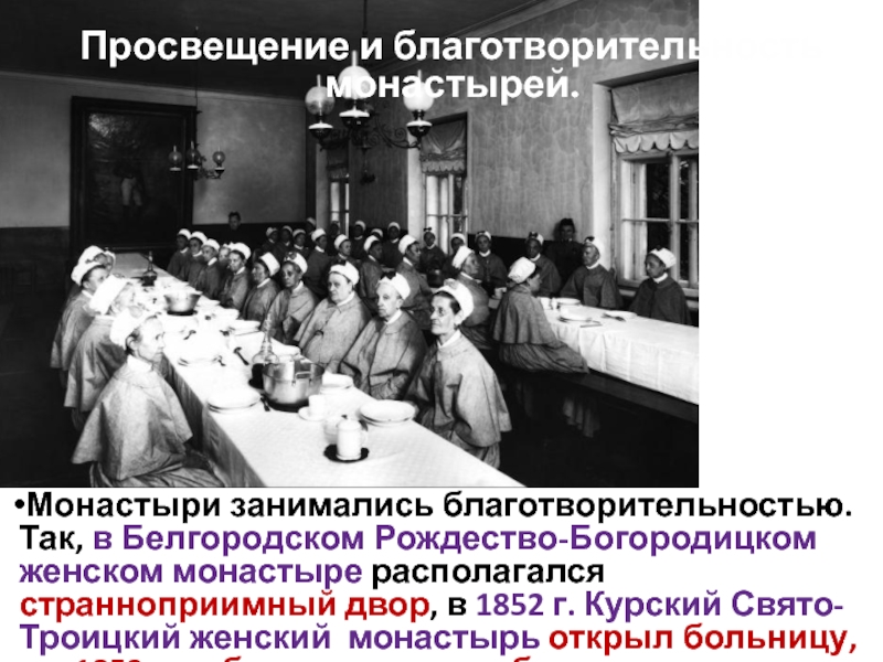 Слайд 34Монастыри занимались благотворительностью. Так, в Белгородском Рождество-Богородицком женском монастыре располагался странноприимный