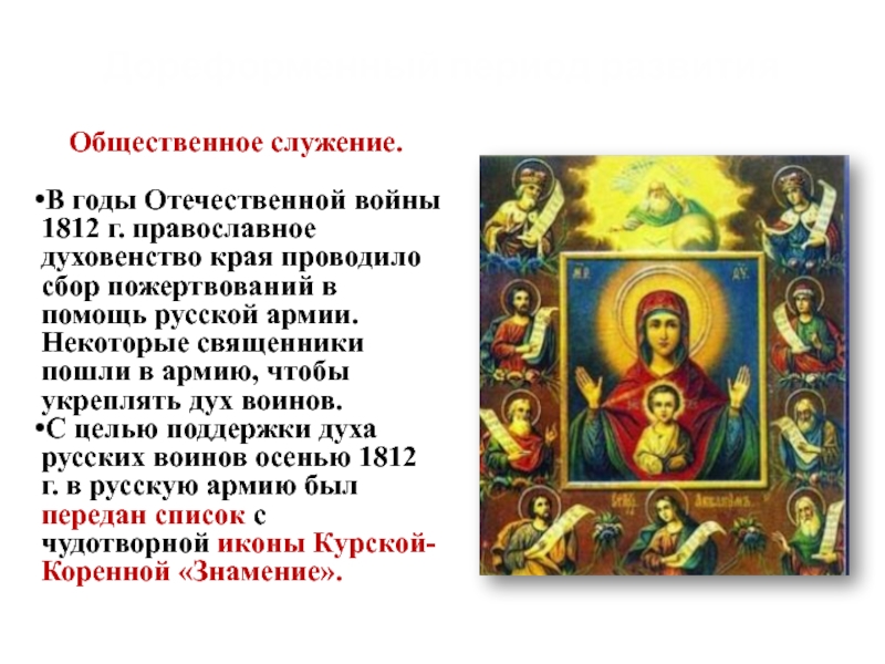 С целью поддержки духа русских воинов осенью 1812 г. в русскую армию был передан список с чудотворной иконы Курской- Коренной «Знамение».