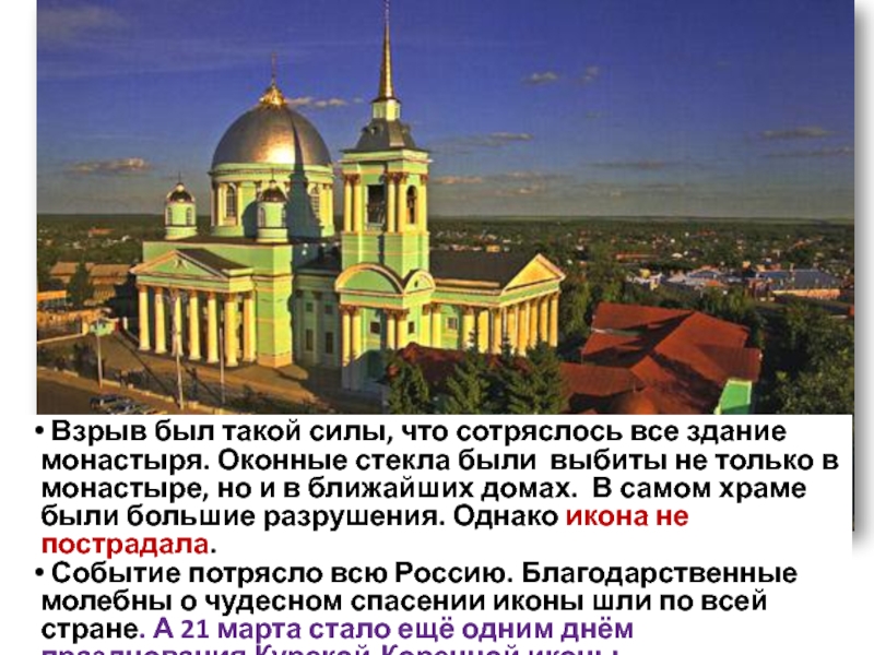 Слайд 36 Взрыв был такой силы, что сотряслось все здание монастыря. Оконные