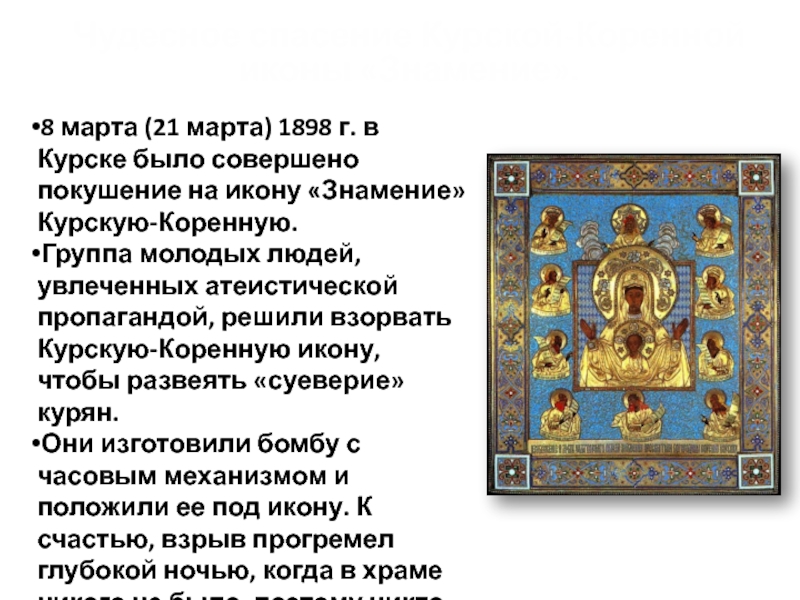 Группа молодых людей, увлеченных атеистической пропагандой, решили взорвать Курскую-Коренную икону, чтобы развеять «суеверие» курян.